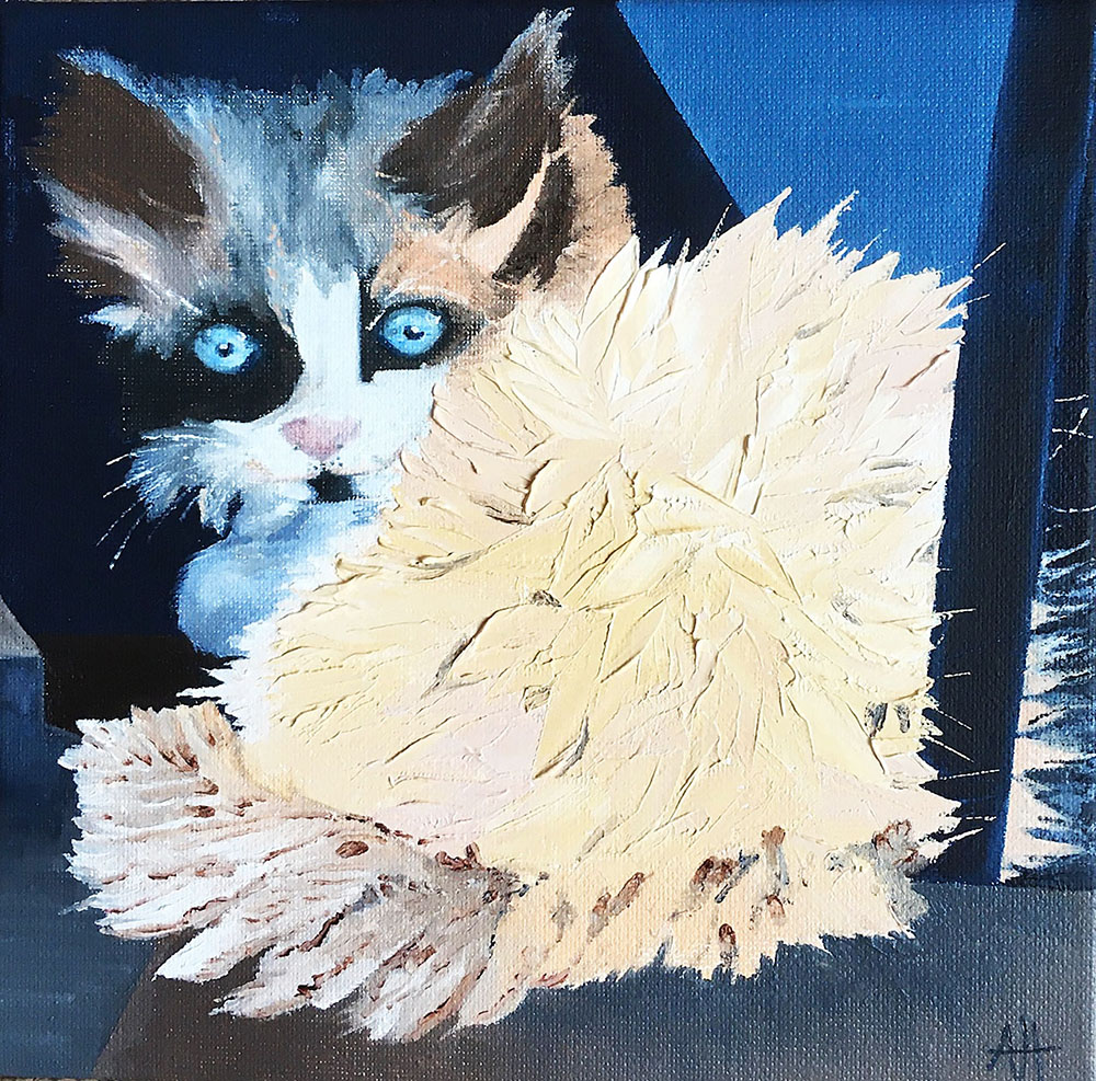 Oil on canvas – This feral kitten was curled up on top of Ann’s food waste bin enjoying the hot July sun and was as surprised to see her as she was to see it. She never saw it again after having taken a photograph, but apparently there were several litters born in the surrounding area last summer. Ann says, “None more striking than this I’m sure!”